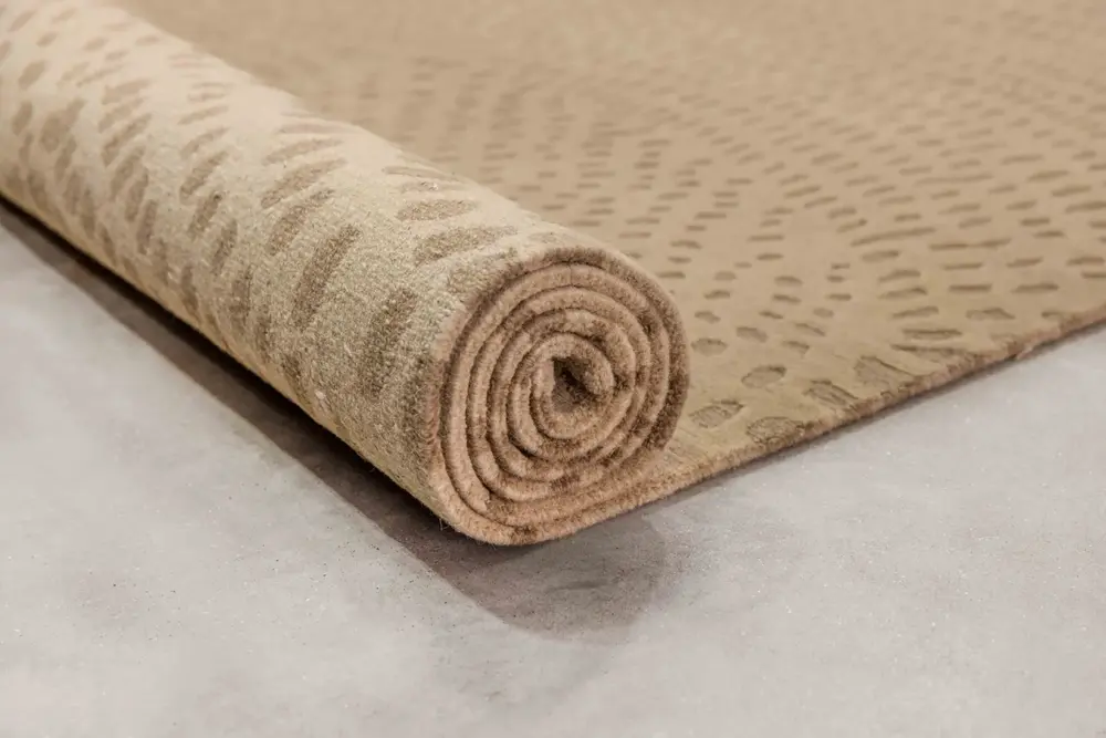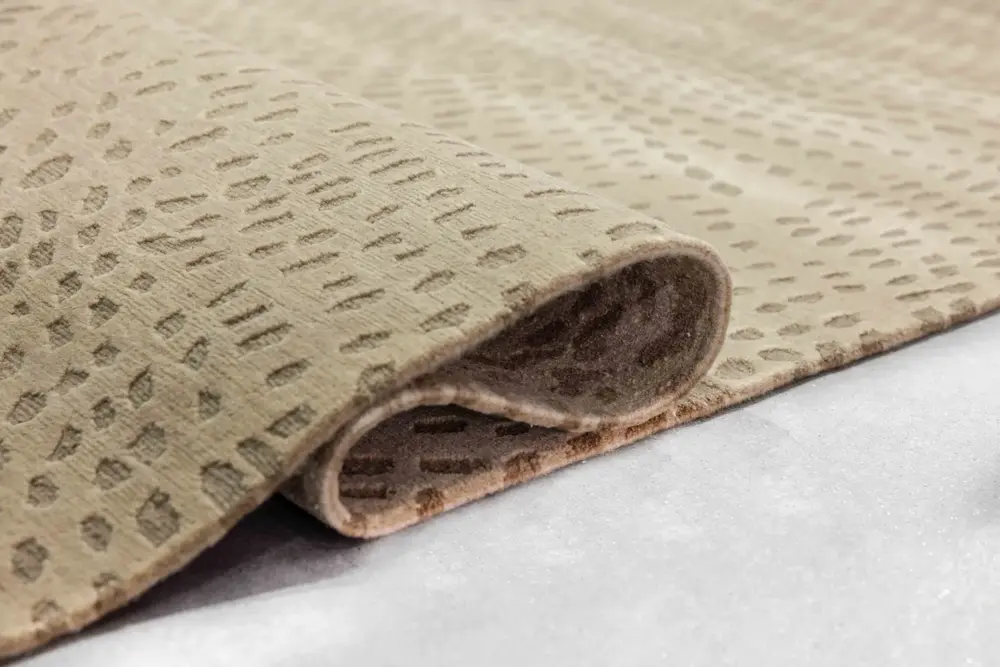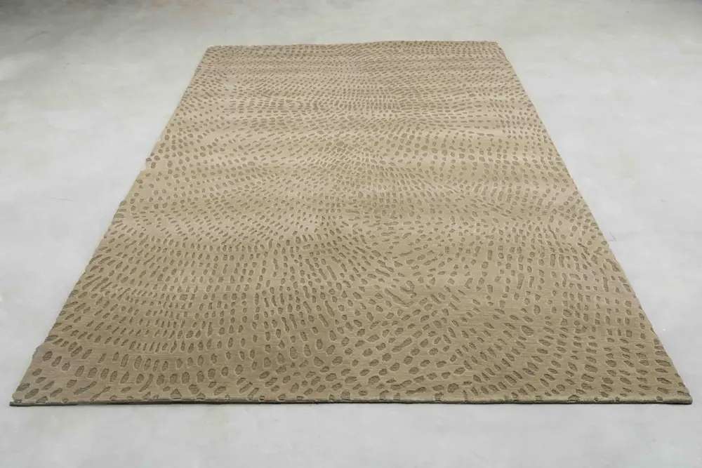 Presenting the “Dot Loop” rug series, a contemporary concept design with asymmetrical dot-like shapes composed of cuts on a high pile of light color and loops on a low pile of dark hue.